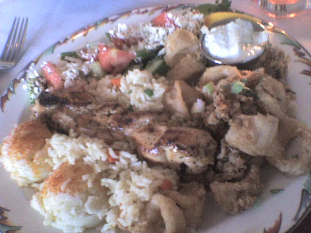 mashpotato, greek salad, calameri, rice, chicken souvlaki(是不是這樣拼?),pita bread